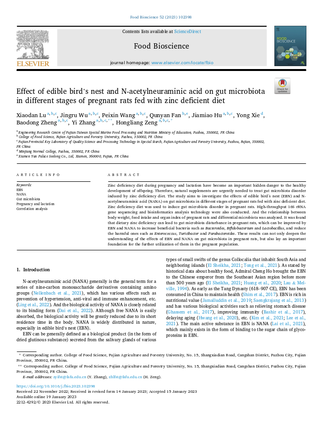 近年來,人們愈發(fā)關(guān)注腸道健康,越來越多的證據(jù)顯示,腸道菌群能夠通過產(chǎn)生菌群代謝產(chǎn)物、影響機體免疫反應、調(diào)節(jié)迷走神經(jīng)及干預腸內(nèi)分泌系統(tǒng)等多種途徑和神經(jīng)系統(tǒng)相互作用。基于此,燕之屋聯(lián)合各大高校持續(xù)對食用燕窩的有益作用展開深入研究。今年1月,燕之屋關(guān)于“Effect of edible bird’s nest and N-acetylneuraminic acid on gut microbiota in different stages of pregnant rats fed with zinc deficient diet(食用燕窩和N-乙酰神經(jīng)氨酸對低鋅飲食孕鼠不同時期腸道菌群的影響)”的研究成果被食品科學領域國際知名SCI期刊《Food Bioscience》收錄。
