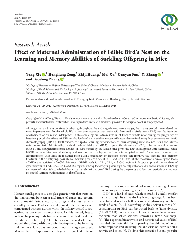 早在2018年3月,燕之屋關(guān)于“Effect of Maternal Administration of Edible Bird’s Nest on the Learning and Memory Abilities of Suckling Offspring in Mice(母鼠食用燕窩對子代學習記憶能力的影響)”的研究成果就登上了食品科學領域國際知名SCI期刊《Neural Plasticity》。研究結(jié)果表明,食用燕窩提升了子代腦內(nèi)海馬體中CA1,CA2和CA3區(qū)域的BDNF(一種神經(jīng)營養(yǎng)因子)水平及CA1,CA2,CA3和DG區(qū)域的染色神經(jīng)元數(shù)量,這標志著子代學習記憶能力的提升。該項研究推測食用燕窩通過增強超氧化物歧化酶和膽堿乙酰轉(zhuǎn)移酶的活性,同時降低腦內(nèi)丙二醛的水平和乙酰膽堿酯酶活性,來緩解氧化應激損傷、改善子代的學習記憶能力,是業(yè)界首次揭示母體食用燕窩對改善子代學習記憶能力的作用及機制的研究。