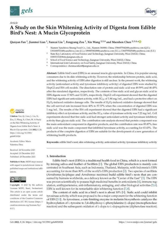 燕之屋潛心燕窩肽研究,成立燕之屋燕窩肽研究中心,聚焦燕窩肽酶解技術(shù)、活性成分與功能研究等多方向賽道,近年來(lái)不斷取得突破,成果斐然。2021年,燕之屋燕窩研究院和江南大學(xué)食品科學(xué)與技術(shù)國(guó)家重點(diǎn)實(shí)驗(yàn)室聯(lián)合完成研究成果“A study on the skin whitening activity of digesta from edible bird's nest: A mucin glycoprotein”,發(fā)布于權(quán)威學(xué)術(shù)性期刊《Gels》;2022年,燕之屋燕窩研究院攜手香港科技大學(xué)攜手完成燕窩肽抗皮膚炎癥功能研究,專(zhuān)業(yè)研究成果“Edible bird’s nest, an Asian health food supplement, possesses anti-inflammatory responses in restoring the symptoms of atopic dermatitis: An analysis of signaling cascades”發(fā)布于權(quán)威學(xué)術(shù)性期刊《Frontiers in Pharmacology》;2023年,燕之屋燕窩研究院通過(guò)體外生化、細(xì)胞、生物三維立體證實(shí)了燕窩肽的抗衰老功效,并在國(guó)際權(quán)威期刊《Journal of Functional Foods》發(fā)表了燕窩肽抗衰研究"Study of the antiaging effects of bird's nest peptide based on biochemical, cellular, and animal models",揭示燕窩肽抗衰老功效,再一次為燕窩肽的研究發(fā)展貢獻(xiàn)有利價(jià)值。近日,燕之屋“一種具有促進(jìn)細(xì)胞修護(hù)、高保濕美白功效的燕窩肽制備方法及應(yīng)用”獲得國(guó)家知識(shí)產(chǎn)權(quán)局發(fā)明專(zhuān)利授權(quán)(專(zhuān)利號(hào):ZL 2022 1 1398048.3),充分證明燕之屋在燕窩肽領(lǐng)域的引領(lǐng)地位。