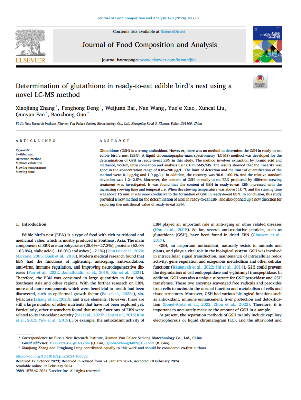 近日,燕之屋在食品科學(xué)領(lǐng)域取得了重大突破,開展的一項(xiàng)題為“Determination of glutathione in ready-to-eat edible bird’s nest using a novel LC-MS method”的研究成果被食品科學(xué)領(lǐng)域國際知名SCI收錄期刊《Journal of Food Composition and Analysis》正式收錄和發(fā)表,證實(shí)了該項(xiàng)研究成果具有科學(xué)性、創(chuàng)新性和可行性,具有推動(dòng)燕窩行業(yè)的科學(xué)研究和產(chǎn)品創(chuàng)新的巨大潛力。該研究率先建立了一種用于測定即食燕窩中谷胱甘肽含量的液相色譜-質(zhì)譜法(LC-MS),具有準(zhǔn)確、穩(wěn)定、快捷的優(yōu)點(diǎn),能夠?qū)崿F(xiàn)對即食燕窩中谷胱甘肽含量的快速、準(zhǔn)確測定,填補(bǔ)了行業(yè)在該領(lǐng)域的空白。