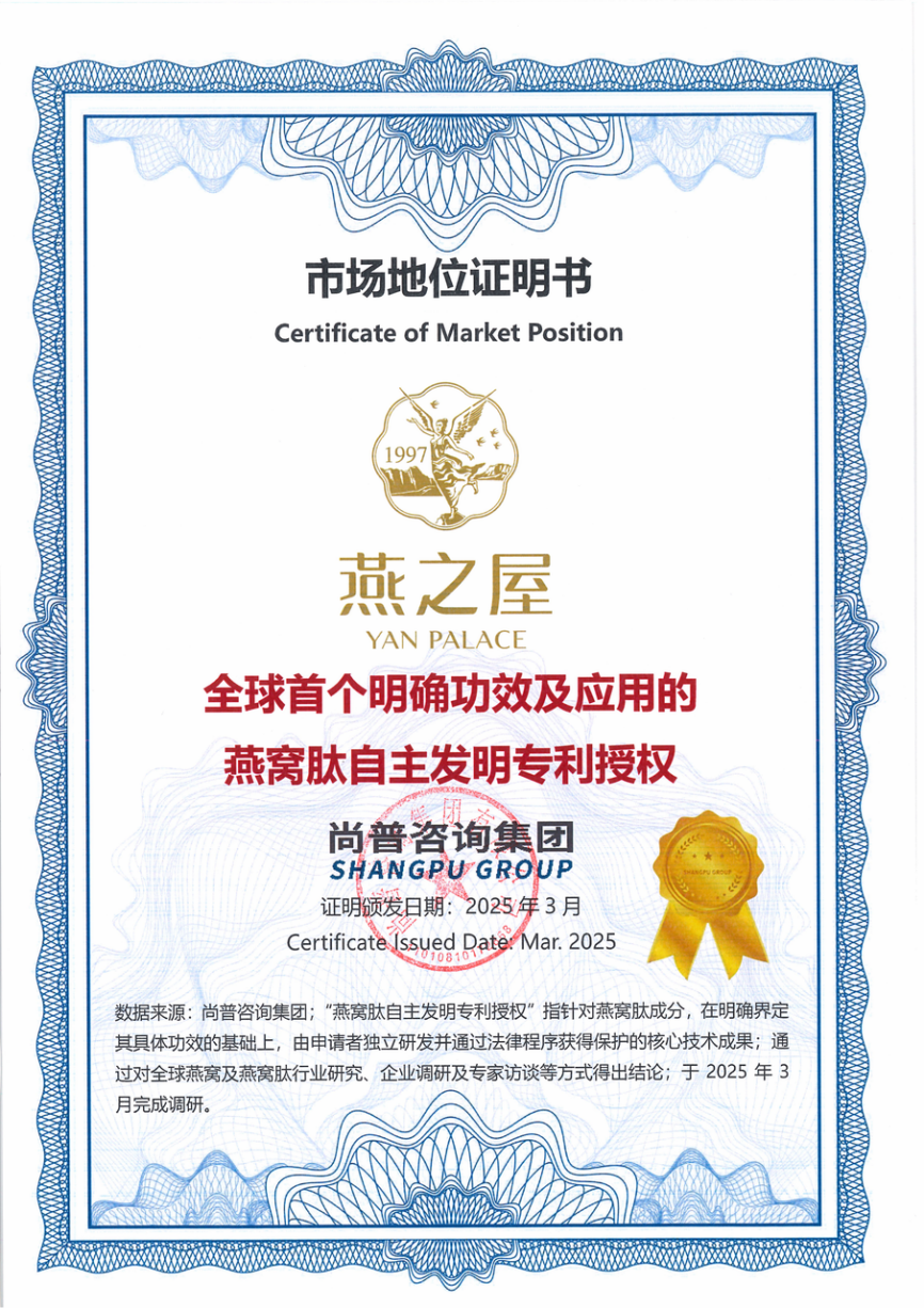 科研實力的卓越體現(xiàn),在于能否攻克行業(yè)共性難題并建立核心技術(shù)標準。燕之屋在燕窩肽領(lǐng)域取得關(guān)鍵突破,于2025年經(jīng)權(quán)威第三方機構(gòu)尚普咨詢集團專業(yè)認證,獲得“全球首個明確功效及應(yīng)用的燕窩肽自主發(fā)明專利授權(quán)①”市場地位證明書。該項認證所基于的核心專利《一種具有促進細胞修護、高保濕美白功效的燕窩肽制備方法及應(yīng)用》(專利號:ZL 2022 11398048.3),徹底改變了傳統(tǒng)燕窩肽“成分模糊、功效籠統(tǒng)”的行業(yè)局面。該專利①明確了燕窩肽的定向酶解工藝,能夠?qū)⒀喔C大分子蛋白質(zhì)精準切割為平均分子量小于3000道爾頓(Da)的活性小分子肽段。通過此工藝制備的燕窩肽,其促進細胞修護、高效保濕及抗氧化等核心功能特性①獲得了明確界定與保護,為產(chǎn)品的科學有效性奠定了堅實的法律與技術(shù)基石。